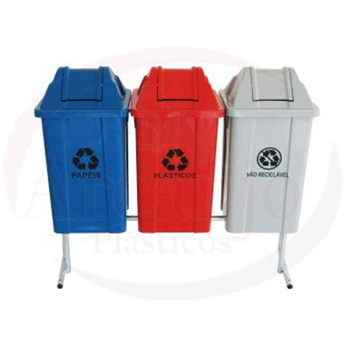O Conjunto RP ST15 tem um design com 3 cestos quadrados com tampa vai-vem, confeccionados em plástico polipropileno e armação em aço carbono galvanizado;
